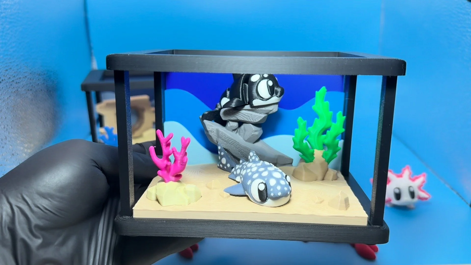 Dive into an underwater adventure with this detailed 3D printed shipwreck fish tank display. Featuring a sunken ship design with a porthole and anchor, it creates the perfect backdrop for your favourite aquatic creatures, including Axolotl, Clown Fish, Flapjack Octopus, Killer whale, Shark, Spotted Shark, or Blue Tang.